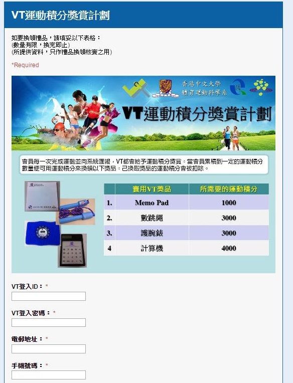5. 若要換領實用獎品,按「實用VT獎品」。「VT運動積分獎賞計劃」換領表格會顯示於新視窗。輸入有關資料後按「提交」,我們便會把實用獎品郵寄到你所提供的郵寄地址。