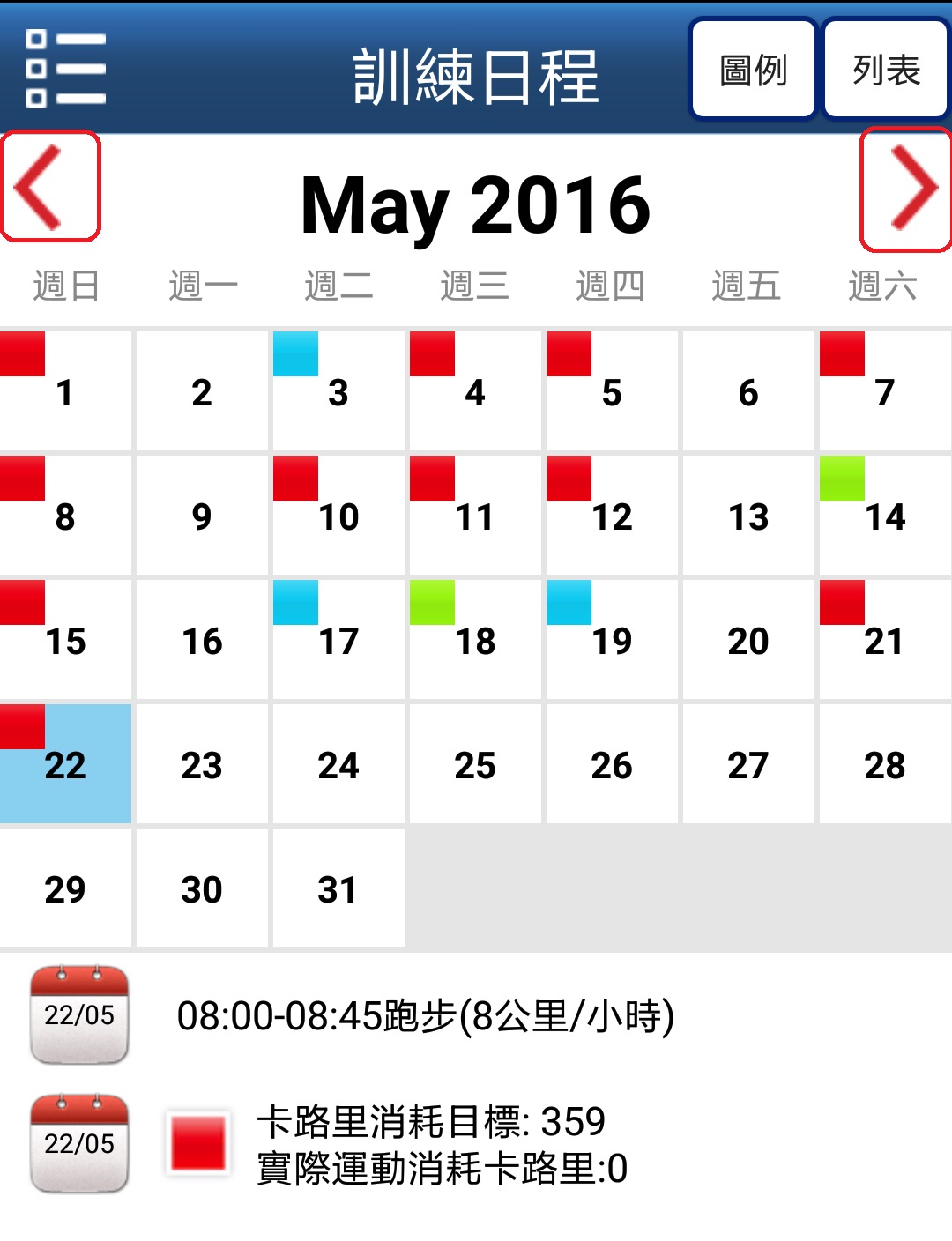 2. 可檢視現在進行的運動處方,已計劃的運動訓練資料。並可按「左」/「右」箭咀圖案選擇要檢視的月份。