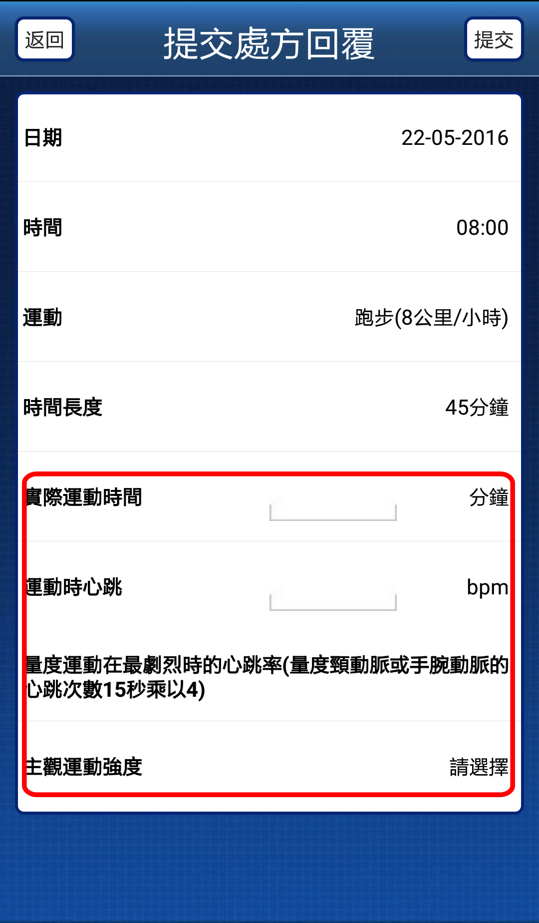 5. 輸入「實際運動時間」,「運動時心跳」和「主觀運動強度」後,按右上角的「提交」。