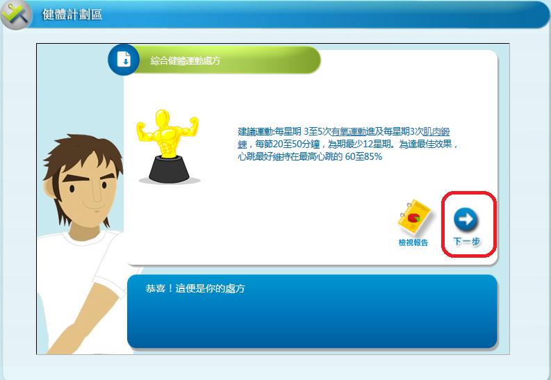 1. 閱讀建議「運動處方」後,按「下一步」。