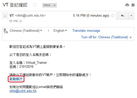 3. 在「送出」後,到已登記的電郵信箱,開啟「VT登記確認」電郵並按「啟動帳戶」。(*注意: 電郵有機會送到垃圾信箱。若主要收件箱未能收到郵件,請檢查垃圾信箱。)