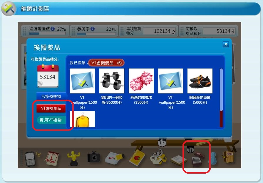 3. 到「健體計劃區」的「換領獎品」部份。獎品分為「VT虛擬獎品」和「實用VT禮物」。
