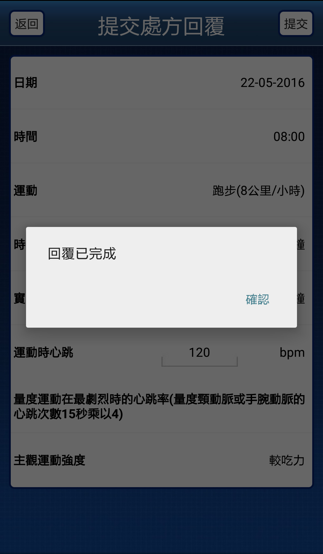 5. 輸入「實際運動時間」,「運動時心跳」和「主觀運動強度」後,按右上角的「提交」。
