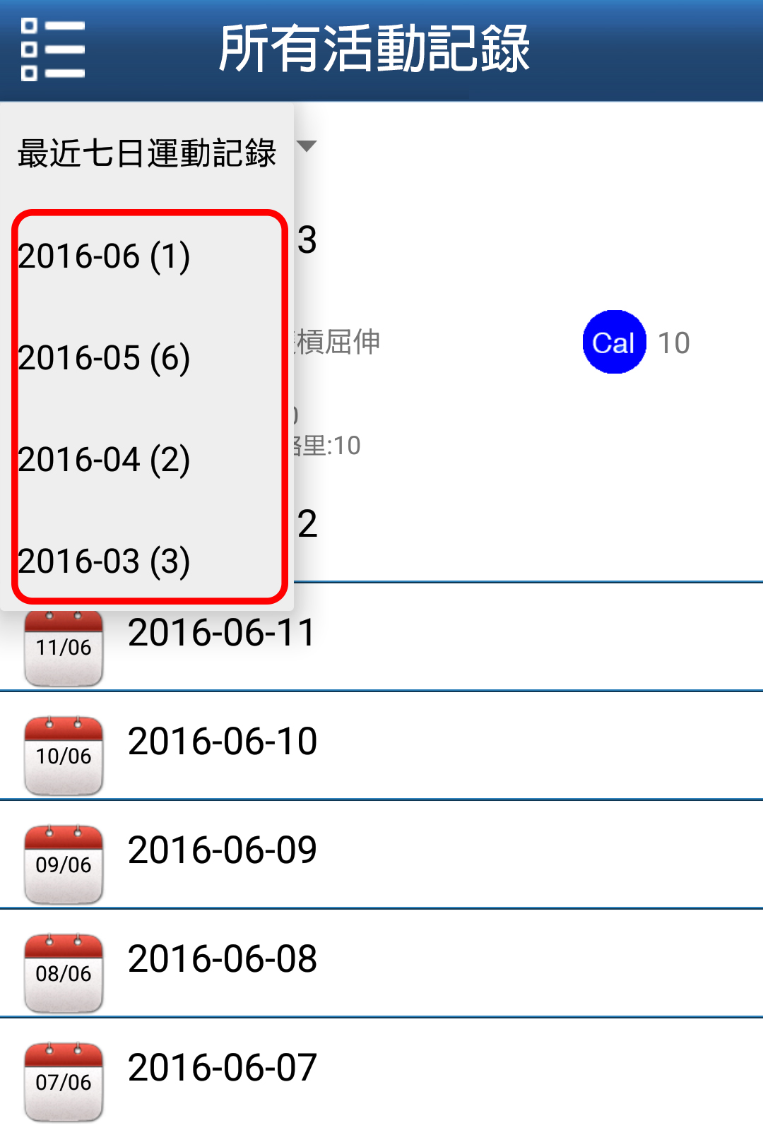 5. 若要檢視之前的活動記錄,可按左上角「最近七日運動記錄」,選擇需要檢視的月份。(*括號內的數字代表有活動記錄的日數)