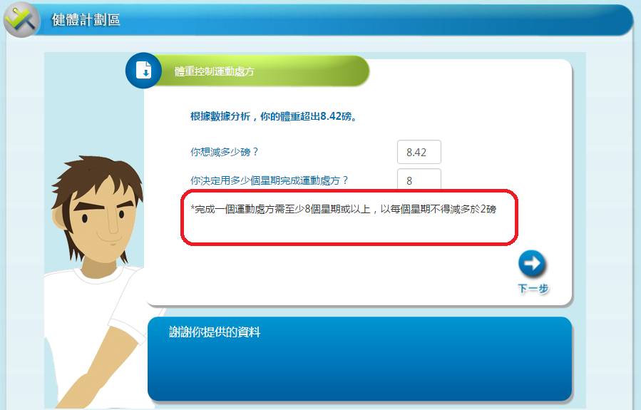 2. 跟隨指示,設定 1) 多少星期完成運動處方和 2) 想減去的體重磅數 (只適用於「體重控制運動處方」); 然後按「下一步」。