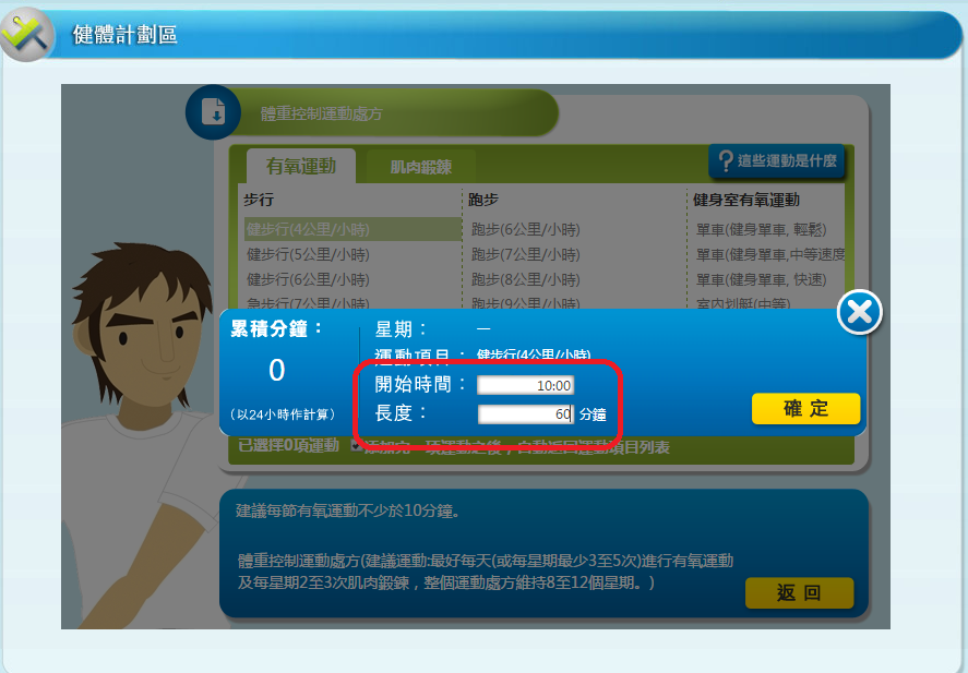 6. 選擇「有氧運動」或「肌肉鍛鍊」項目後,輸入運動 1) 開始時間,和 2) 長度; 然後按「確定」。