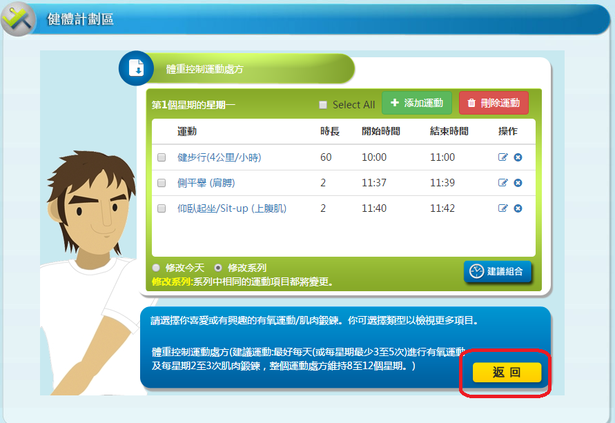 7. 確定一天的運動計劃後,按「返回」