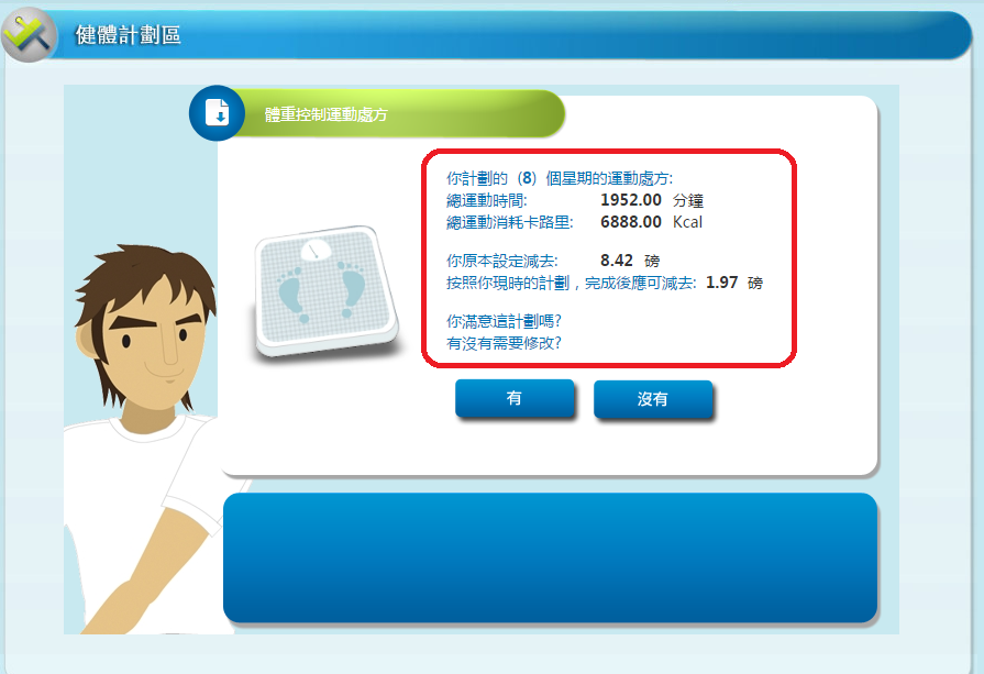 9. 查閱你所設定的運動計劃。1) 若不滿意所設定的計劃,按「有」返回之前版面進行修改; 2) 若滿意所設定的計劃,按「没有」到下一步。